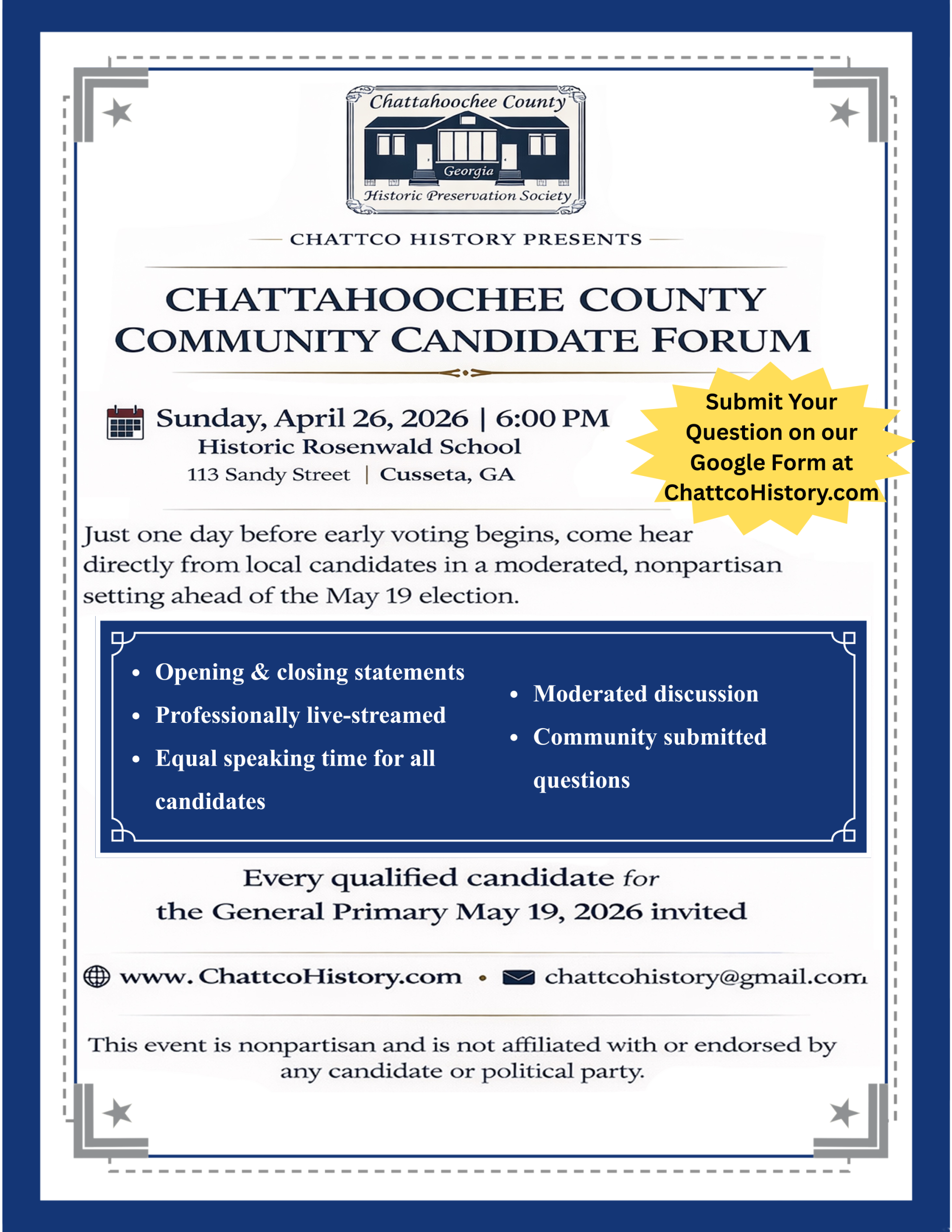 Chattahoochee County Candidate Forum β Question Submission Form Click Here…